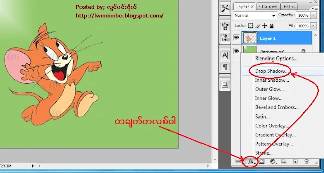 Enter ေခါက္ျပီးရင္ ေအာက္ကပံုအတိုင္း ျမင္ရပါျပီ.. ဒီေနရာမွာ စျပီး ေနာက္ကအရိပ္ထြက္ေအာင္ လုပ္ပါျပီ.. အဲ့ဒီေတာ့ ေလယာေဘာက္စ္ရဲ႕ ေအာက္ဆံုးက Fx ေနရာမွာ တခ်က္ကလစ္ျပီး Drop Shadow ကိုထပ္ကလစ္ပါ.. ပံုမွာျပထားပါတယ္..